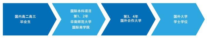 学生在华南师范大学国际商学院学习1-3年(具体学习时长视不同项目而定),国外合作大学认可豁免华南 师大课程学分。学生完成国内课程,雅思成绩达到相关要求后,可赴国外合作大学继续学习1-3年(具体学习时长 视不同项目而定),完成学业后获国外大学本科学位。学生还可以在此基础上申请继续攻读硕士学位。
