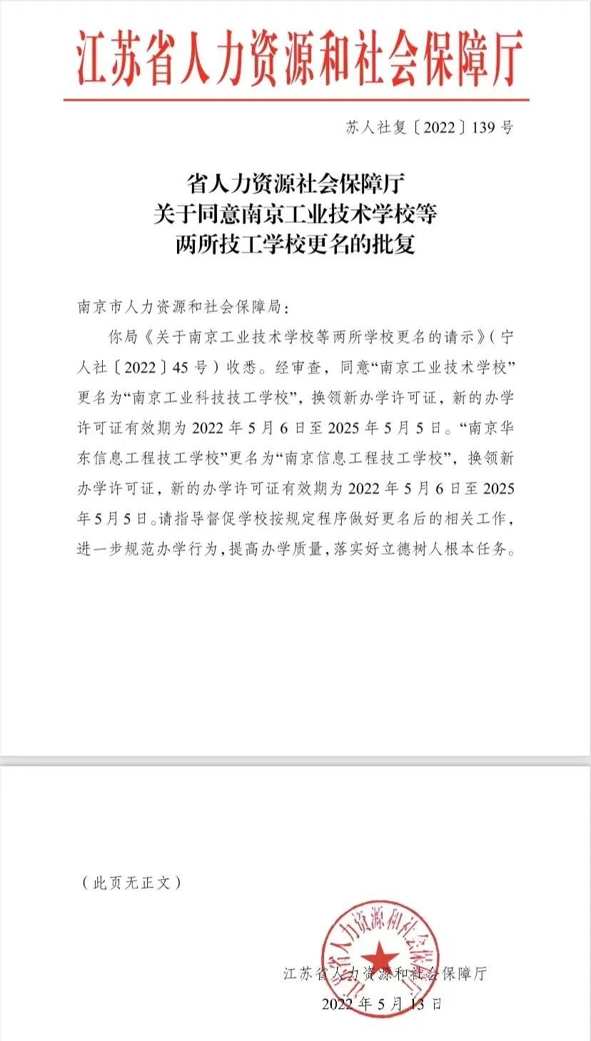 为了适应新时期学校发展的需要。根据苏人社发【2021】第63号文及苏人社函【2022】第70号文的要求,经学校申请,由南京市人力资源和社会保障局报江苏省人力资源和社会保障厅审查批准,省人社厅同意我校校名由原“南京工业技术学校”更名为“南京工业科技技工学校”(见苏人社复【2022】139号文),换领新的办学许可证。在此,我们表示热烈的祝贺!