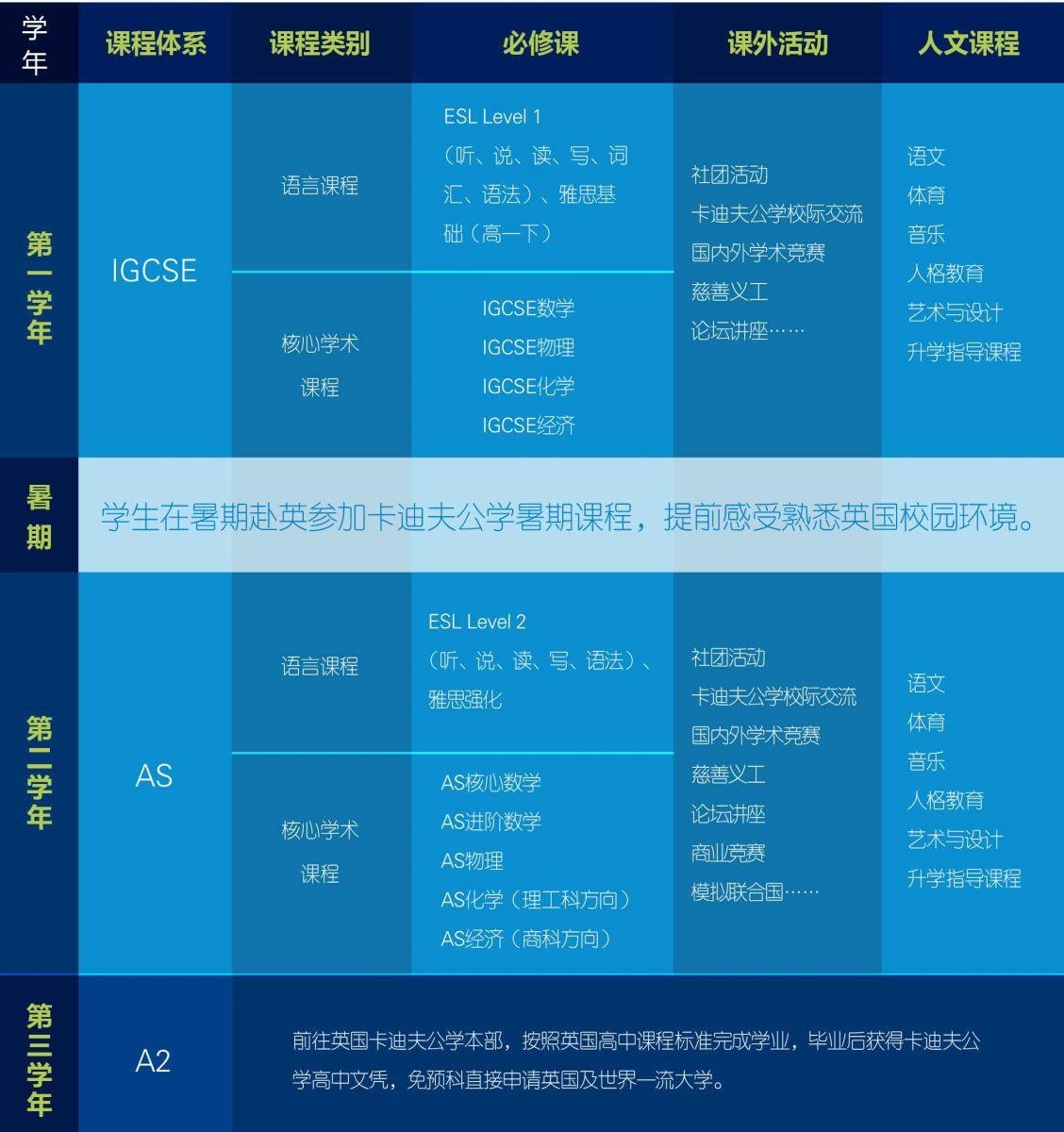 学校为学生安排了2+1学制,即学生前两年在卡迪夫公学·上海校区接受全日制教育,学习GCSE和AS,完成从国内走向海外的全面过渡;A2阶段直接进入卡迪夫公学英国本部校区继续学业,期间享受与英国本土学生完全一样的规划指导待遇及大学面试机会。