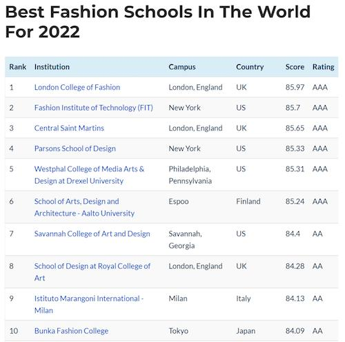 2022全球最 佳时装学院top 10