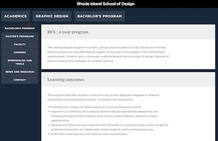 罗德岛设计学院的平面设计注重对艺术设计的理解,注重引导学生思考哲学、社会、艺术、设计,各种思潮主义都怎么影响平面设计,又怎么影响着社会、艺术。教学形式以专题讨论课居多,每周需要阅读大量的艺术文献。