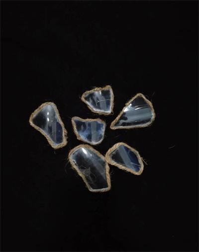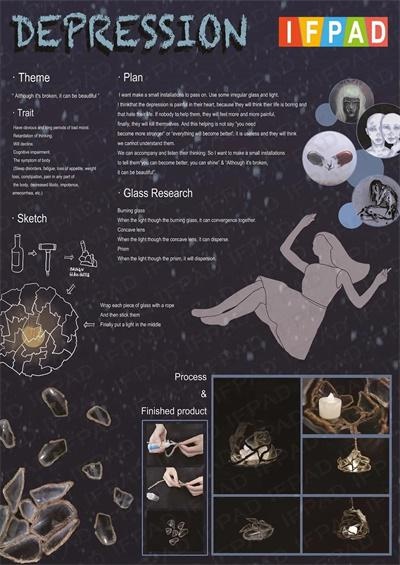 这个作品的名字叫《BROKEN OR NOT》,围绕的主题是近几年备受人们关注的一种心理疾病——抑郁症。我在网上查了很多关于抑郁症的特征和例子,发现很多抑郁症患者都会认为自己的生活是破碎的、不完整的、不美好的,所以我运用了碎玻璃和麻绳来做了一盏灯。