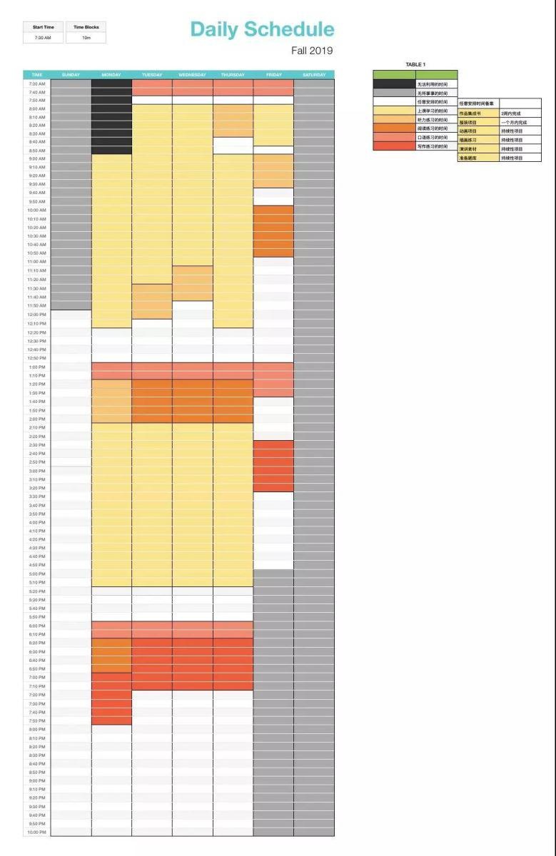 以如上安排为例,项目内容又分为“不可活动”项目,如上课,和“可活动项目”,如晨读。计划开始之初不需要给出一个明确的时间规定,根据自己的行为习惯,来完成这些项目。给自己两周的时间形成大致固定的时间线。尤其注意对“可活动项目”的安排。