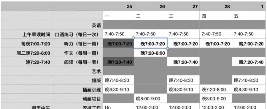 当时间线逐渐固定,这个时候便是将其具体到详细的时间,如晨读(7:50—8:10)。切记,无论是上午、下午、还是晚上一定要留出至少30分钟的弹性时间,以应对临时下达的任务。新版本的计划将用一周的时间验证时间的准确性。当然这不是结束,当确认你的时间披萨这就是你好的那口时,你就需要制作一张打卡的表以督促你完成项目。(这对强迫症患者的效果是指数倍的,不信你就试试!)