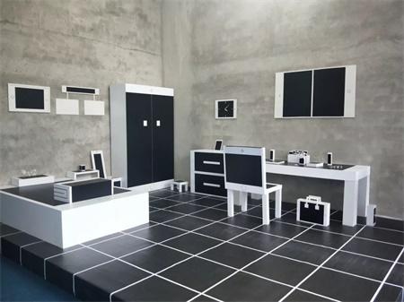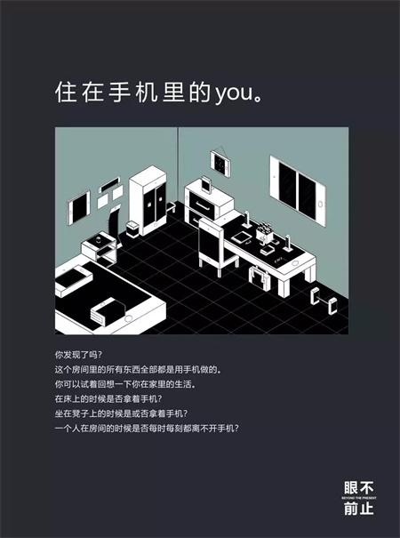 房间中的床、桌椅、衣柜等家具和摆设品均是手机模型,意味手机在生活中无处不在。