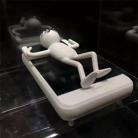 在这个展览里,郭羽杰设计了一个戴着眼镜的白色火柴人作为主角,有36张关于手机与生活的插画,6个3d打印的实体模型,还有1个全部用KT板制作而成的模拟的卧室,叫做“住在手机里的你”。