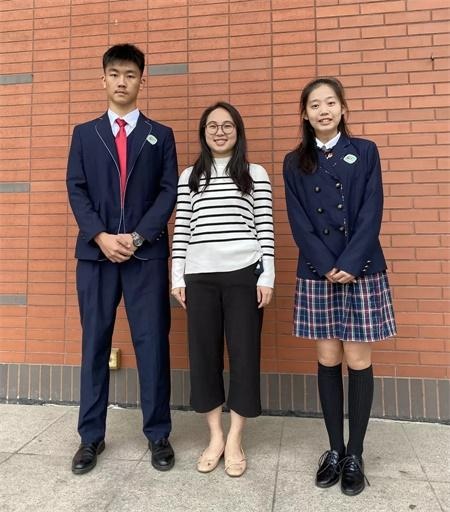 IFPAD高二郭羽杰与班主任黄明媚老师及本周校会主持人合照