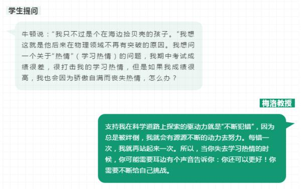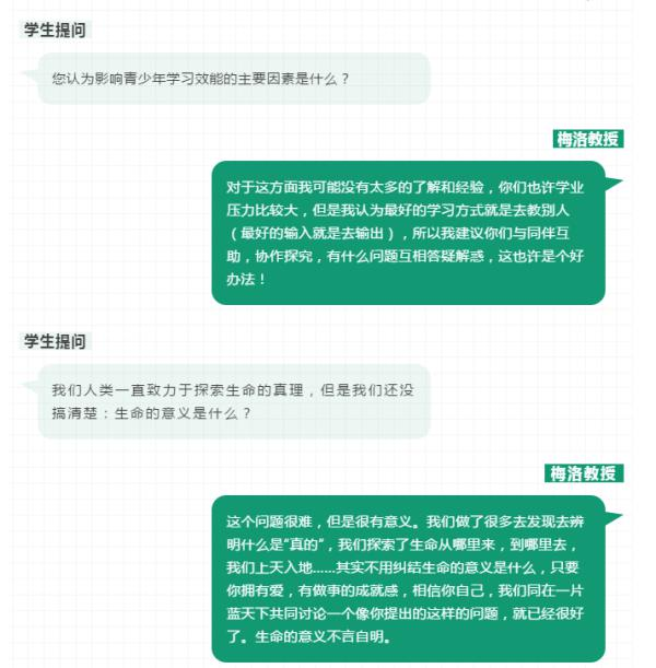 恰逢期中考试结束,一些学生提出了对考试成绩以及选科乃至对生命终极意义的困惑。对此,梅洛教授认为青少年要追寻内心,找到动力和热情。他提到自己的弟弟就是一名金属工,虽然工作平凡而普通,但是弟弟却十分热爱并且做得很好。
