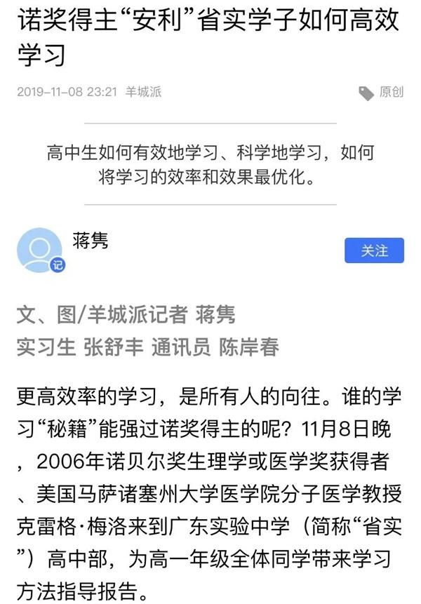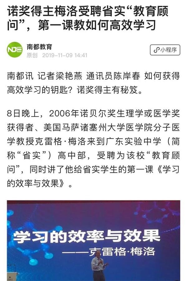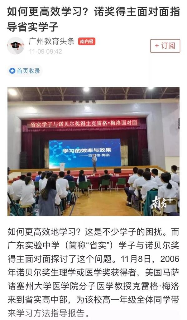 继1996年诺贝尔化学奖获得者罗伯特·柯尔教授、2004年诺贝尔化学奖获得者阿龙·切哈诺沃教授之后,又一位诺贝尔奖获得者莅临广东实验中学讲学,与省实学子互动交流。