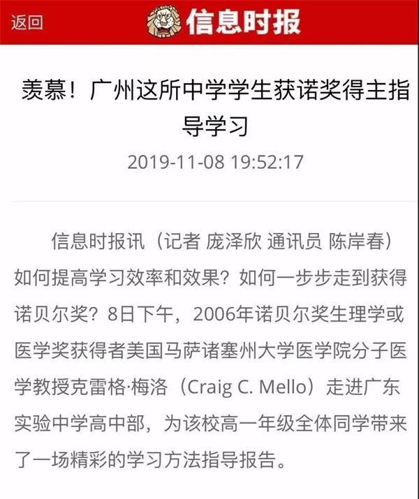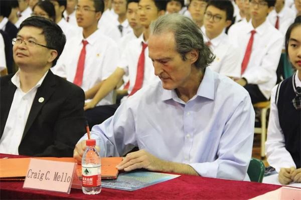11月8日下午,2006年诺贝尔生理学或医学奖获得者美国马萨诸塞州大学医学院分子医学教授克雷格·梅洛(Craig C. Mello)莅临广东实验中学高中部,为高一年级全体同学带来了一场精彩的报告。陪同前来的有中国旅美科技协会总会会长、全球创新中心副总干事、西门子研究中心博士后宋云明先生。广东实验中学党委书记兼校长全汉炎、副校长黄建伟出席了报告会。报告会由高一南山2班张芃林同学主持,高一南山3班林卓言和林可珺两位同学担任翻译。