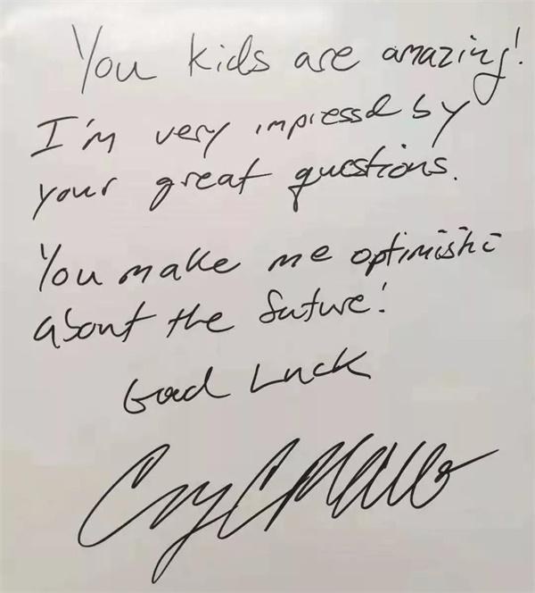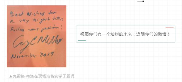 梅洛教授对高中生如何有效、科学地学习,如何将学习的效率和效果较优化,提出了诸多有益的建议与策略,并题词勉励同学们:“Best wishes for a very bright future. Follow your passion!”