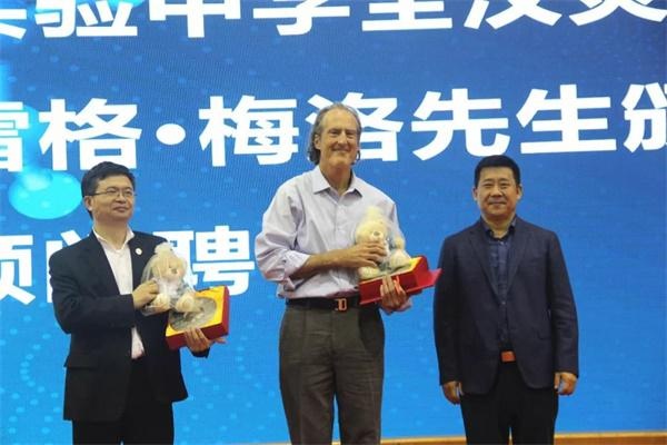 随后,举行了简洁而隆重的聘任仪式。全汉炎校长将“广东实验中学教育顾问”聘书授予梅洛教授,并代表学校赠送纪念品。