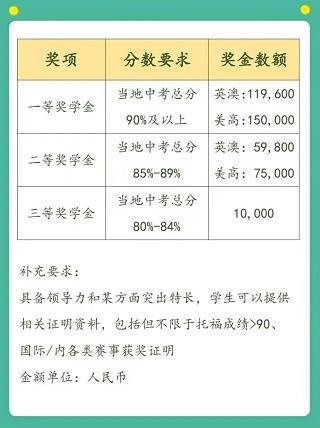 22届中考成绩达总分80%及以上的学生可提出奖学金申请。新生入学奖学金适用于所有申请中美、英澳的22届中考毕业生,奖学金名额不限。