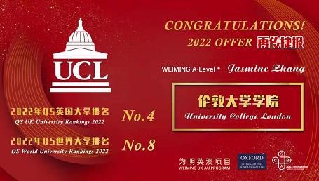 近日,为明英澳项目再斩世界名校录取, 英澳A-Level+ 2021届毕业生Jasmine Zhang同学凭借SACE ATAR98.05分,雅思6.5分、A-Level项目式学习项目A的成绩,获得英国伦敦大学学院录取。