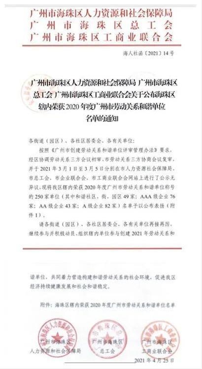近日,广州市海珠区人力资源和社会保障局、广州市海珠区总工会、广州市海珠区工商业联合会联合公布了海珠区荣获2020年度广州市劳动关系和谐单位的名单,我校被评为2020年度广州市劳动关系和谐单位AAA级。