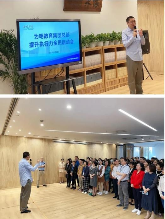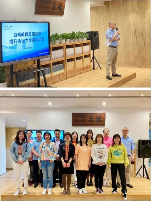 2021年5月8日,为明教育集团总部提升执行力全员启动会在为明书院活力开幕!这是继4月27日为明教育集团总部执行力提升领导小组成立之后的全员启动会议。林浩董事长任组长,集团助理总裁兼人力资源总监梁勇任政委。迎着5月的晨光,为明教育集团总部执行力提升工作小组——向阳花战斗队就位!伴着声声早安的问候,为明教育总部全体员工聚齐!和着欢呼的声浪,为明教育林浩董事长和CEO周猛入场!为明教育助理总裁兼人力资源总监梁勇的主持点燃了现场的热情。