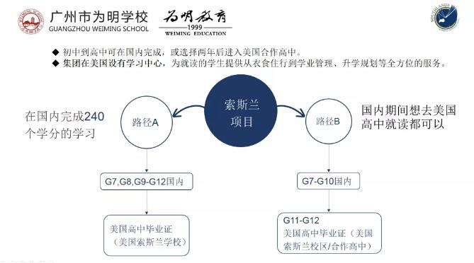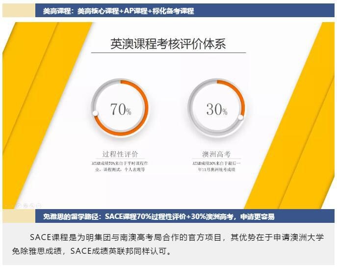 为明引进的美高课程采用双通道模式,针对学生的个性化需求和自身特点,学生既可在中国读完国际高中后直接申请美国大学,或选择国内学习两年后直接进入学校美国中心的合作高中出国完成学业,提前适应国外语言、文化环境。