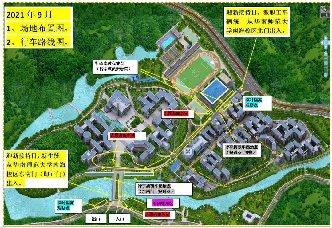 华南师范大学南海校区东南门大桥桥头处,行李接驳车在起始点在正门桥头位置,届时会有许多热情的学生志愿者带领大家前往报到点,并帮助大家熟悉校园。