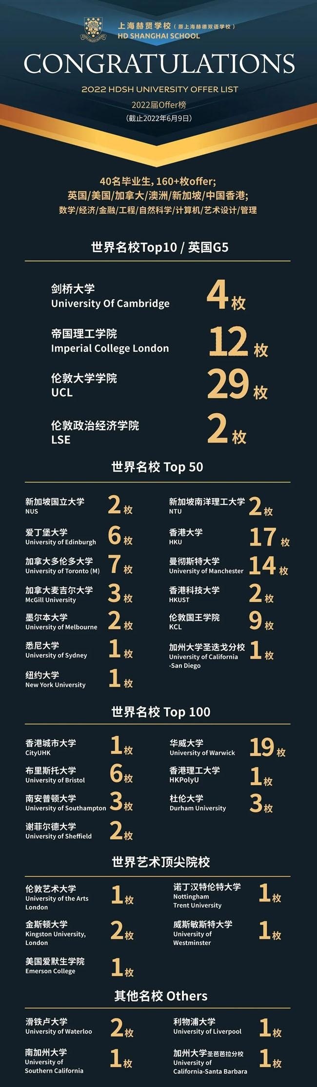 上海赫贤高中部有着一支学术实力非常强劲的教师团队。我们坚持小班教学,师生比达到1:5,在学术校长Steve Chou和各学科负责人的带领下,今年毕业季一举拿下了47枚世界TOP10/英国G5学校的Offer,总Offer数突破160枚,平均人手4枚,其中世界艺术院校的Offer也收入了6枚!创下了赫贤学校有史以来的最高录取纪录!