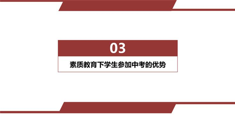 素质教育下学生中考的优势1、综合能力更强:活动的设计和组织全部交给学生,素质教育下的孩子综合能力更强。2、思维更开阔:素质教育更注重学生的思维模式,中考越来越注重对学生思维的考察,枫叶的教育一直都倾向于开阔学生的思维,枫叶学子的思维更开阔。