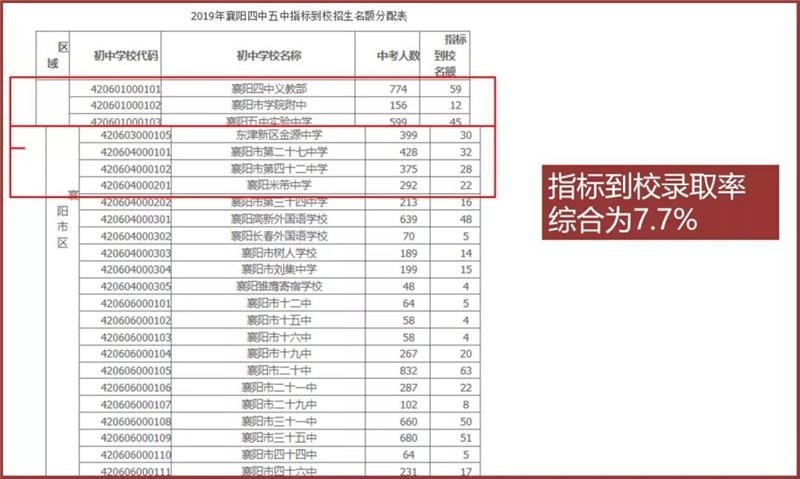 目前学生中考情况的预估这是2019年襄阳四中五中指标到校的数据表,通过去年数据显示:指标到校录取率综合为7.7%,两年后,枫叶的学子也会成为其中的7.7%。